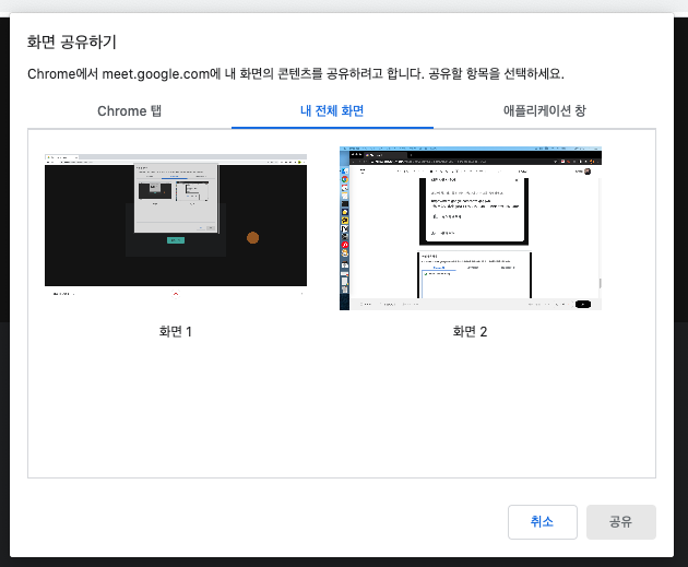 여기서 Chrome 탭, 내 전체 화면, 애플리케이션 창에서 원하는 것을 고를 수 있습니다.