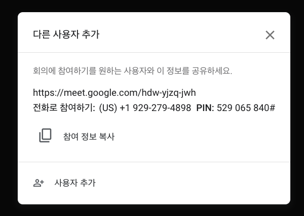 해당 URL은 https://meet.google.com/xxx-xxxx-xxx 이렇게 생겼습니다.