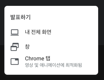 | Chrome 탭 | 내 전체 화면 | 애플리케이션 창 | |