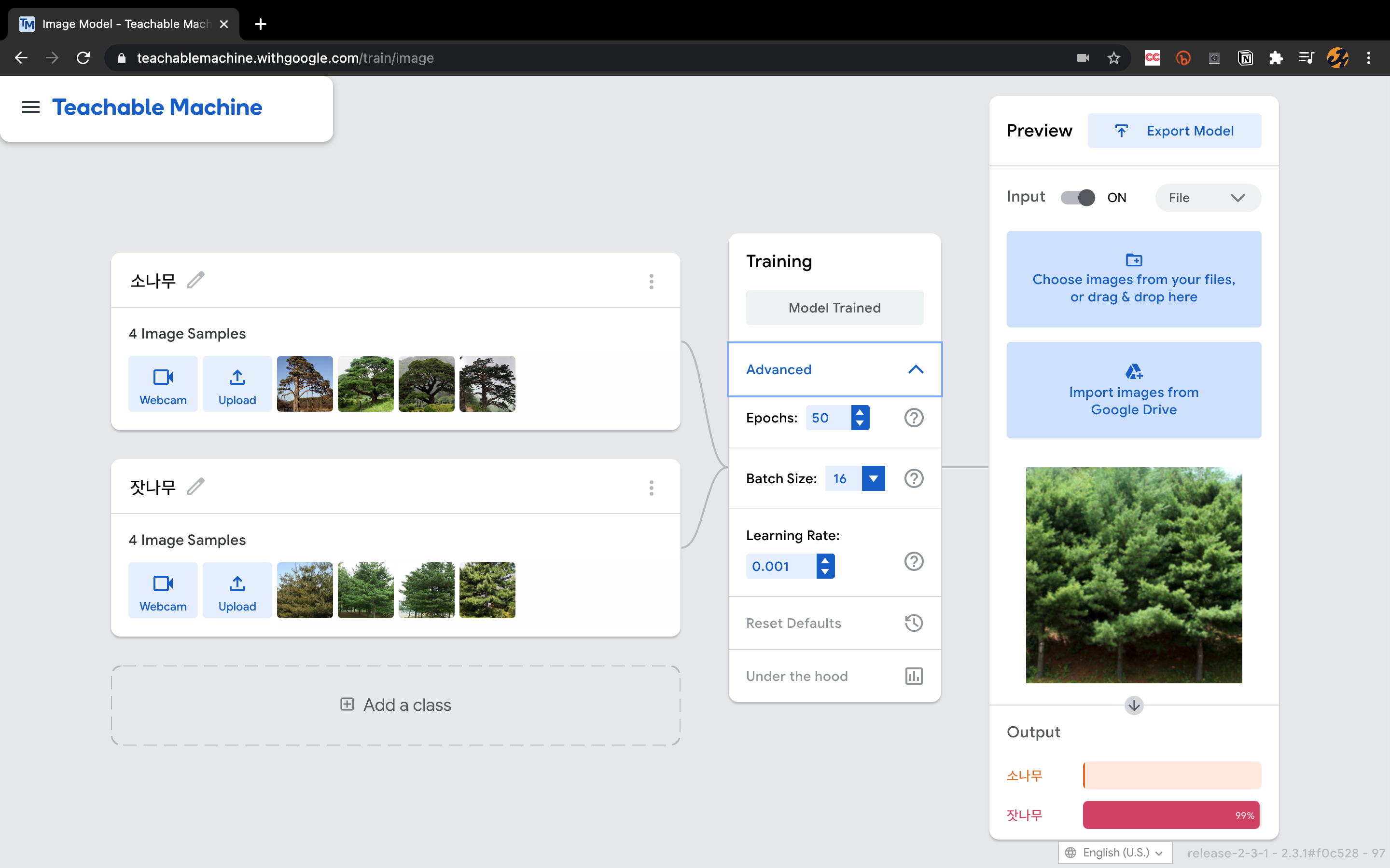 예를 들어 저는 잣나무와 소나무 이미지를 넣어서 훈련을 시켰습니다.