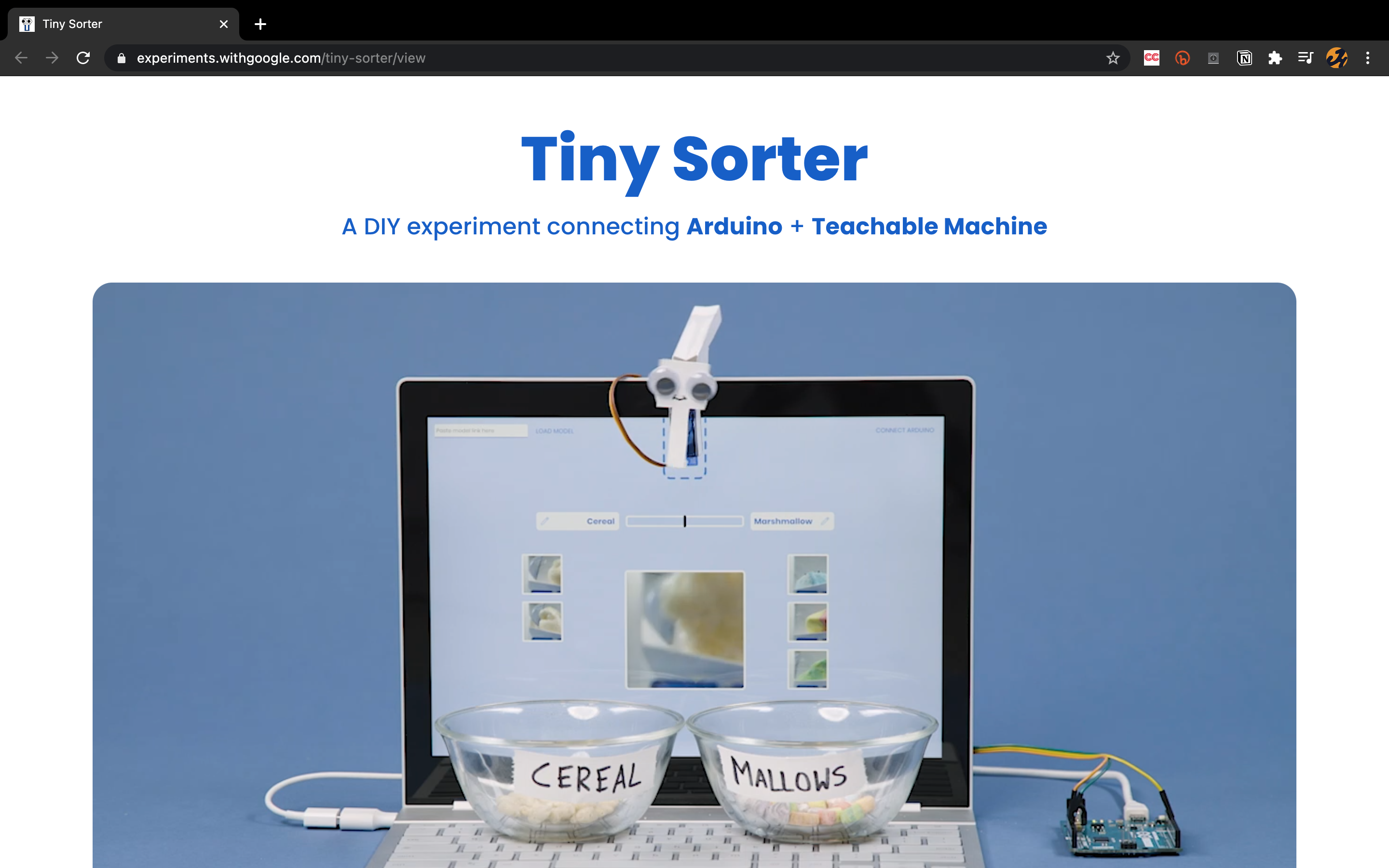 Meet Tiny Sorter, a fun starter project that teaches you about machine learning and physical computing — together, in a hands-on DIY way. See how well you've trained your model by dropping in cereal and seeing if it goes into the right bucket. Align the
