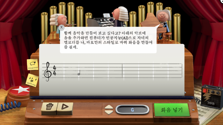 - 바흐 두들은 바흐의 306편의 곡을 바탕으로 만든 AI 도구로, 두 마디의 악보 안에 원하는 음을 넣으면 적절한 화음을 넣어 바흐 풍의 곡을 만들어줍니다.