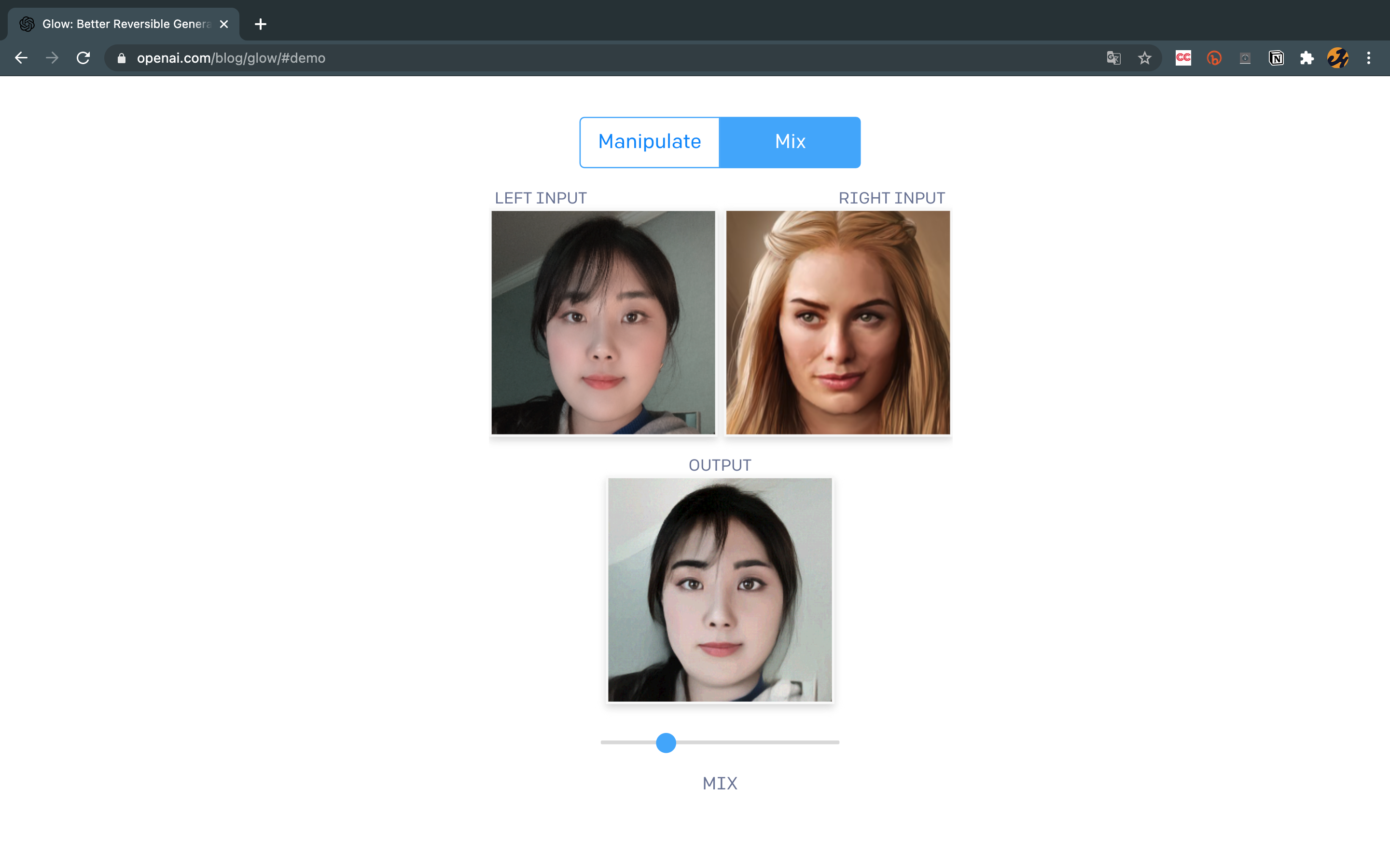 - Mix 기능의 경우, 섞을 두 인물의 사진을 왼쪽과 오른쪽에 각각 업로드합니다. 하단의 버튼으로 섞는 비율을 조정할 수 있습니다. - 언어: 영어