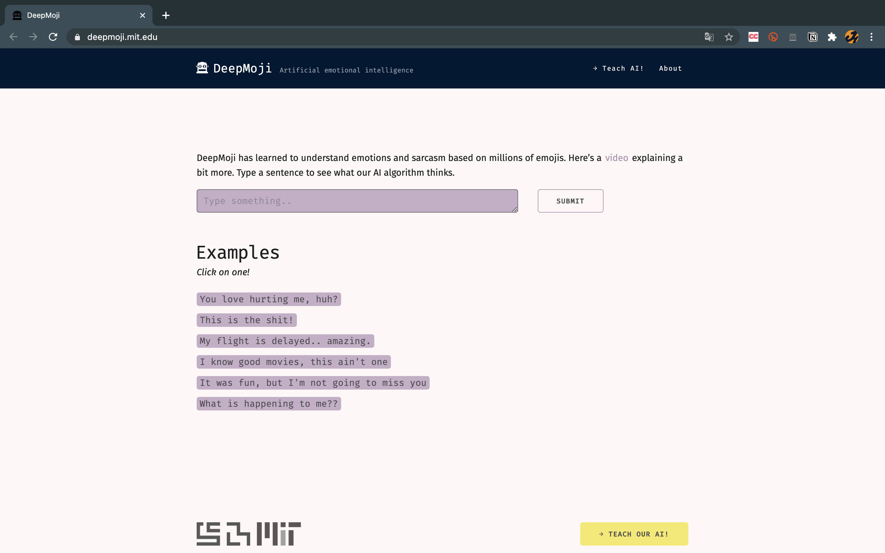 - 소개: MIT에서 과학 연구 프로젝트의 일환으로 2017년 8월부터 2020년 7월까지 진행된 연구 프로젝트의 결과물입니다. 트위터에서 이모티콘을 사용한 수백만 개의 트윗을 바탕으로, 사용자가 입력한 문장에 포함된 이모티콘을 추측하는 모델입니다. 모델이 특정 문장에 맞는 이모티콘을 예측할 수 있다면, 해당 모델이 그 문장에 포함된 감정적 맥락을 잘 이해할 것이라는 가정 하에 제작되었습니다.