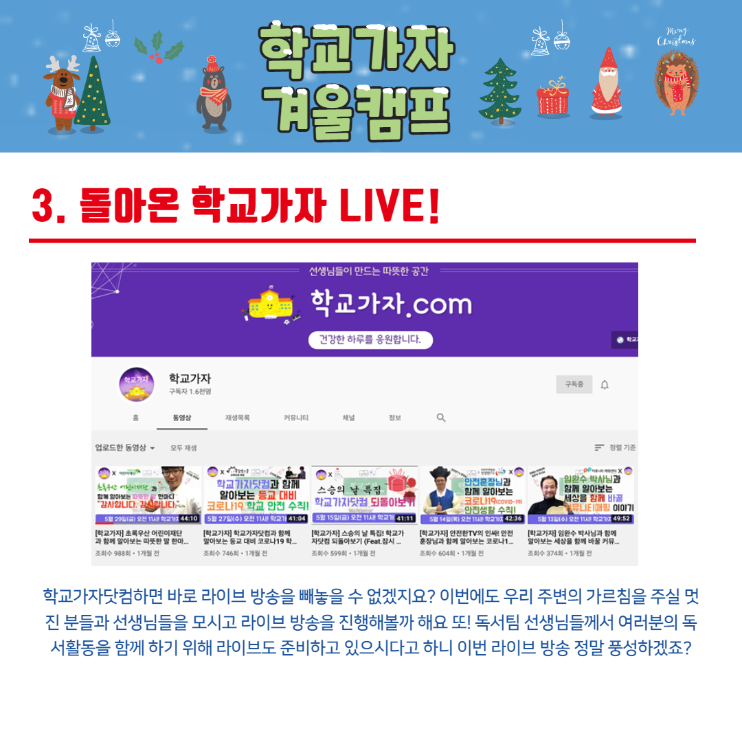 4. 매주 진행되는 학교가자닷컴 라이브 방송과 독서 라이브 방송