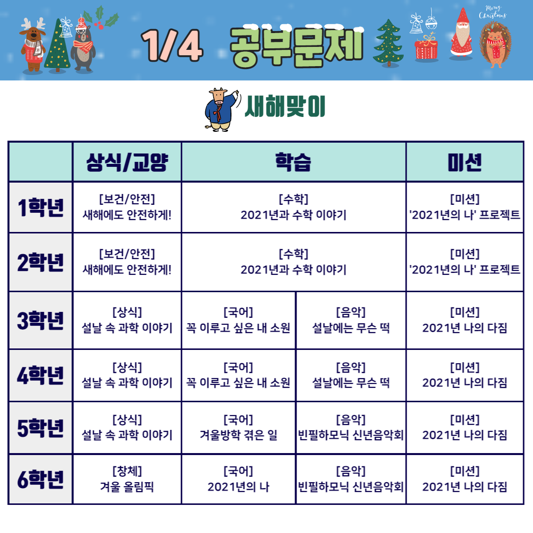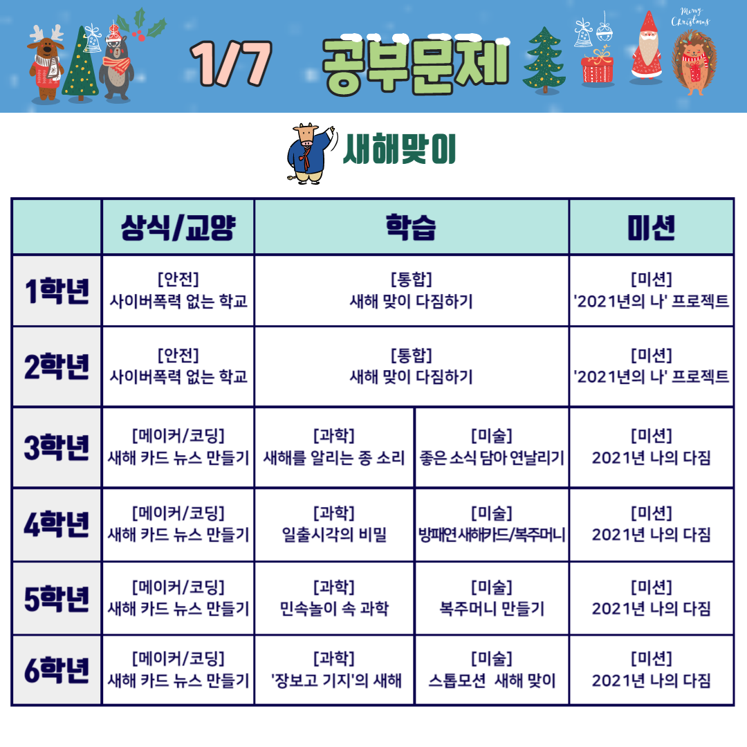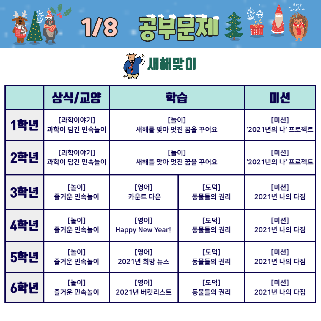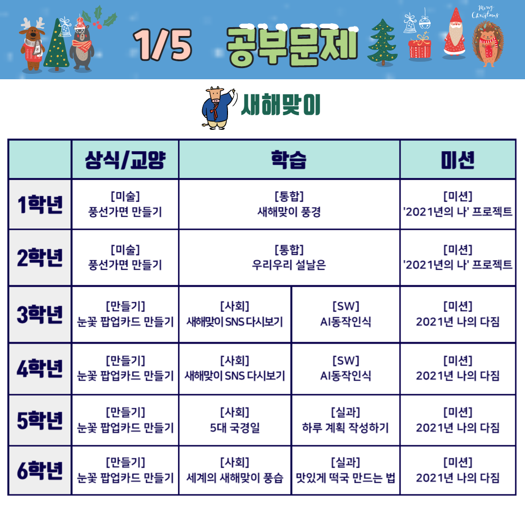 초등학생을 위한 학교가자 온라인 겨울캠프 2주(12.28~1.1)은 "새해맞이"를 주제로 준비하였습니다. 어떤 흥미로운 주제가 준비되어 있는지 살펴볼까요?