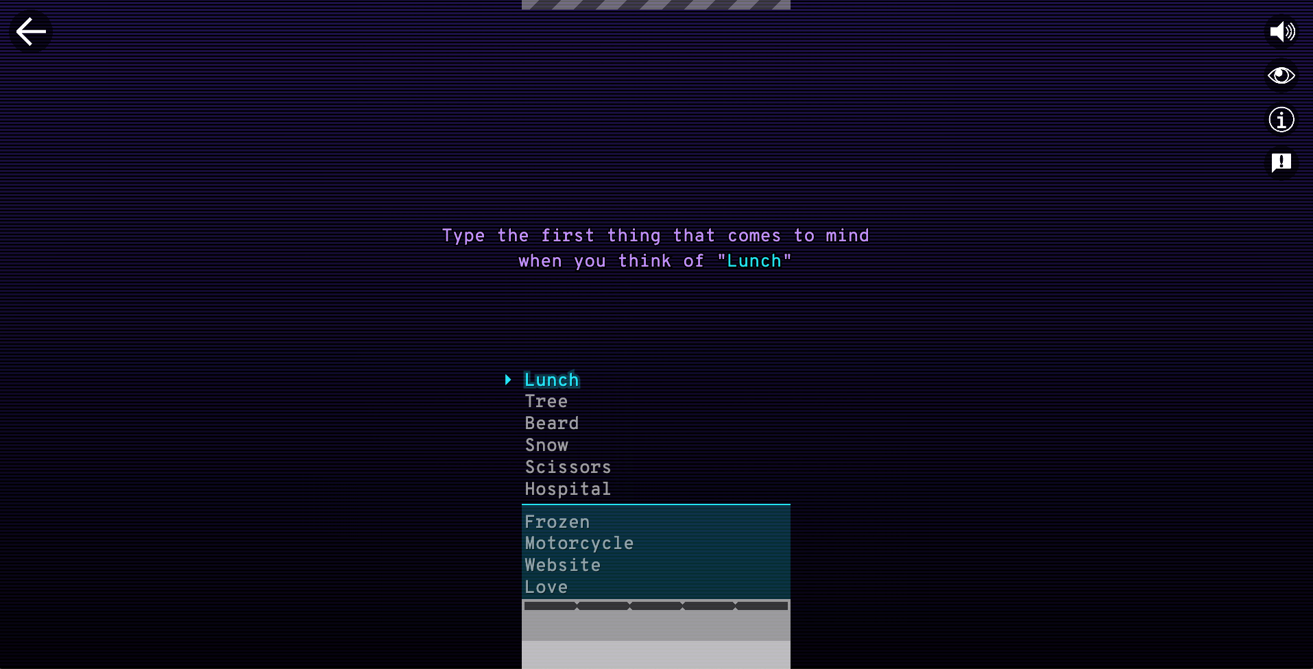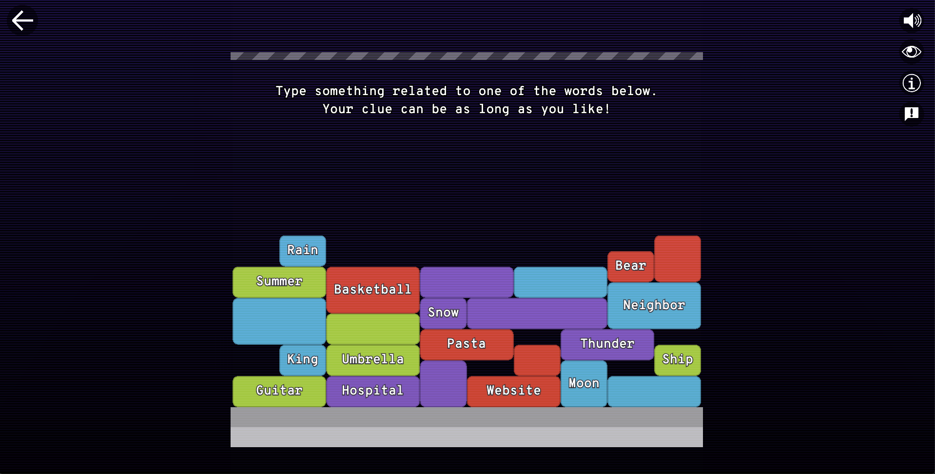 - 블록(Blocks) 모드: 화면에 나타난 단어와 연관된 영단어를 입력하면, AI 모델이 그 단어와 관련이 있는 단어의 블록을 없앱니다. 예를 들어 rain을 입력하면 summer 와 unbrella 블록이 사라집니다. 사라진 블록의 개수만큼 점수를 얻습니다.