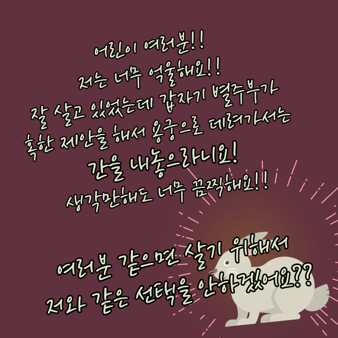 지난 2020년 12월부터 2021년 1월까지 5주에 걸친 겨울캠프에서 책꽃길은 저학년 친구들과 함께 우리나라 고전인 '별주부전'을 천천히 그리고 깊이 읽었어요. 그리고 친구들만의 별주부전을 새롭게 만들어보기도 했어요. 함께 살펴볼까요?