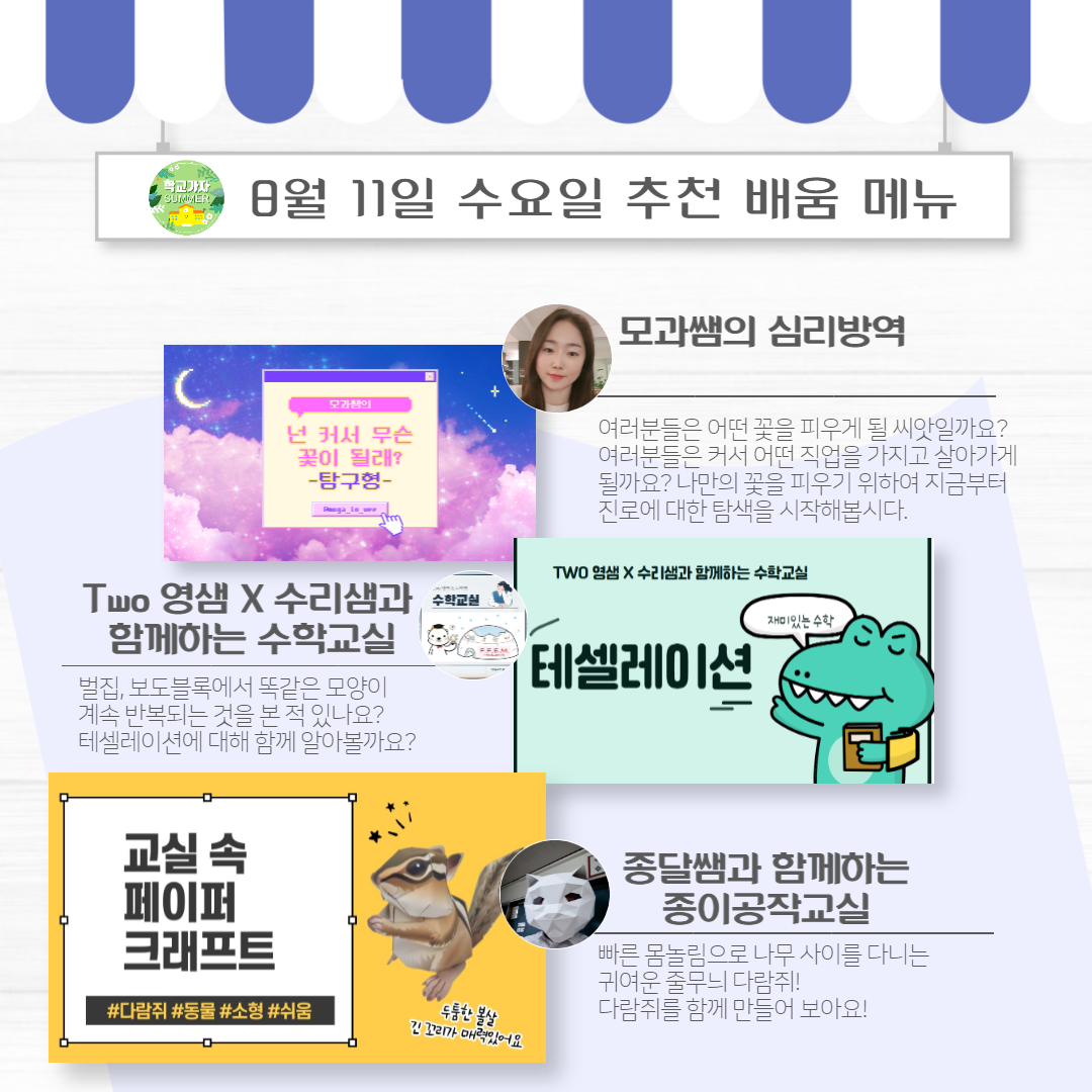 | 초등 학교가자 온라인 여름캠프 1주 [스스로 성장하는 즐거운 여름방학] (0) | 2021.07.18 |